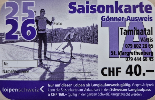 Die Örtliche Saisonkarte ist auf allen Loipen im Taminatal (Vättis & St. Margrethenberg) gültig.